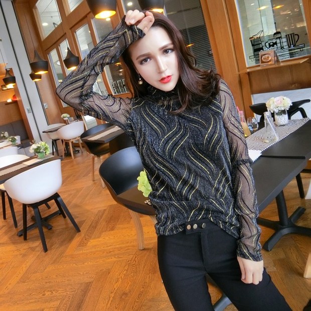 • Elegant Ladies High Neck See-through Gauze Tee Top